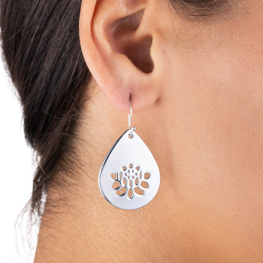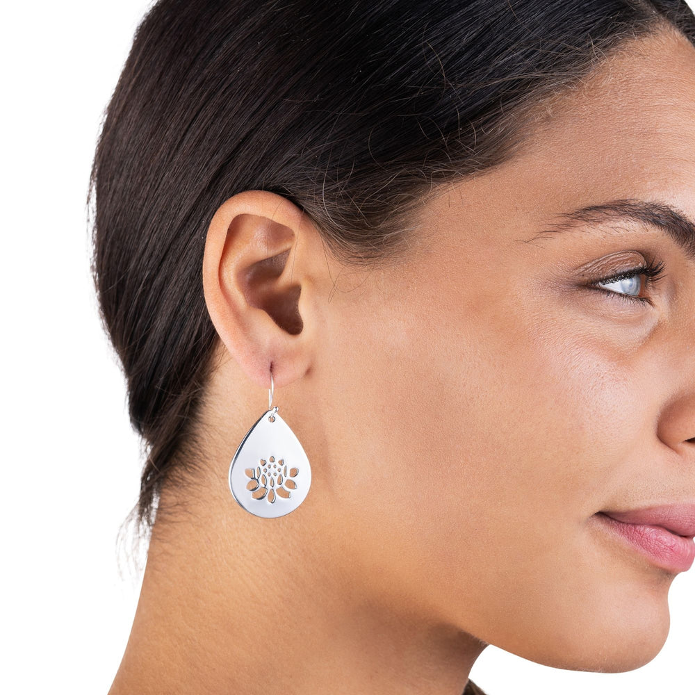 Lotus Earrings. Lotus cutout on silver finished teardrop shaped steel with Sterling Silver ear wires.