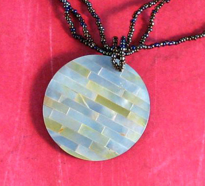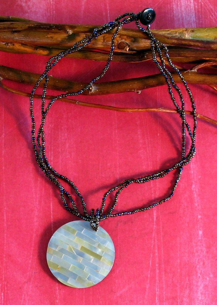 Cut tile shell pieces make up this design. Button closure. Measures: 17 inches. Contains no metals.