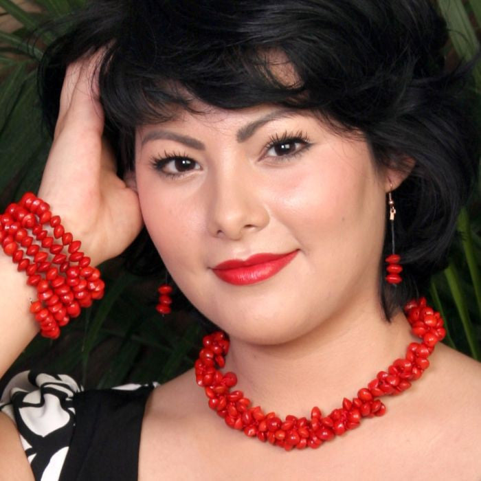 Striking, natural red platino seeds from the rainforests of Colombia make up this beautiful necklace.